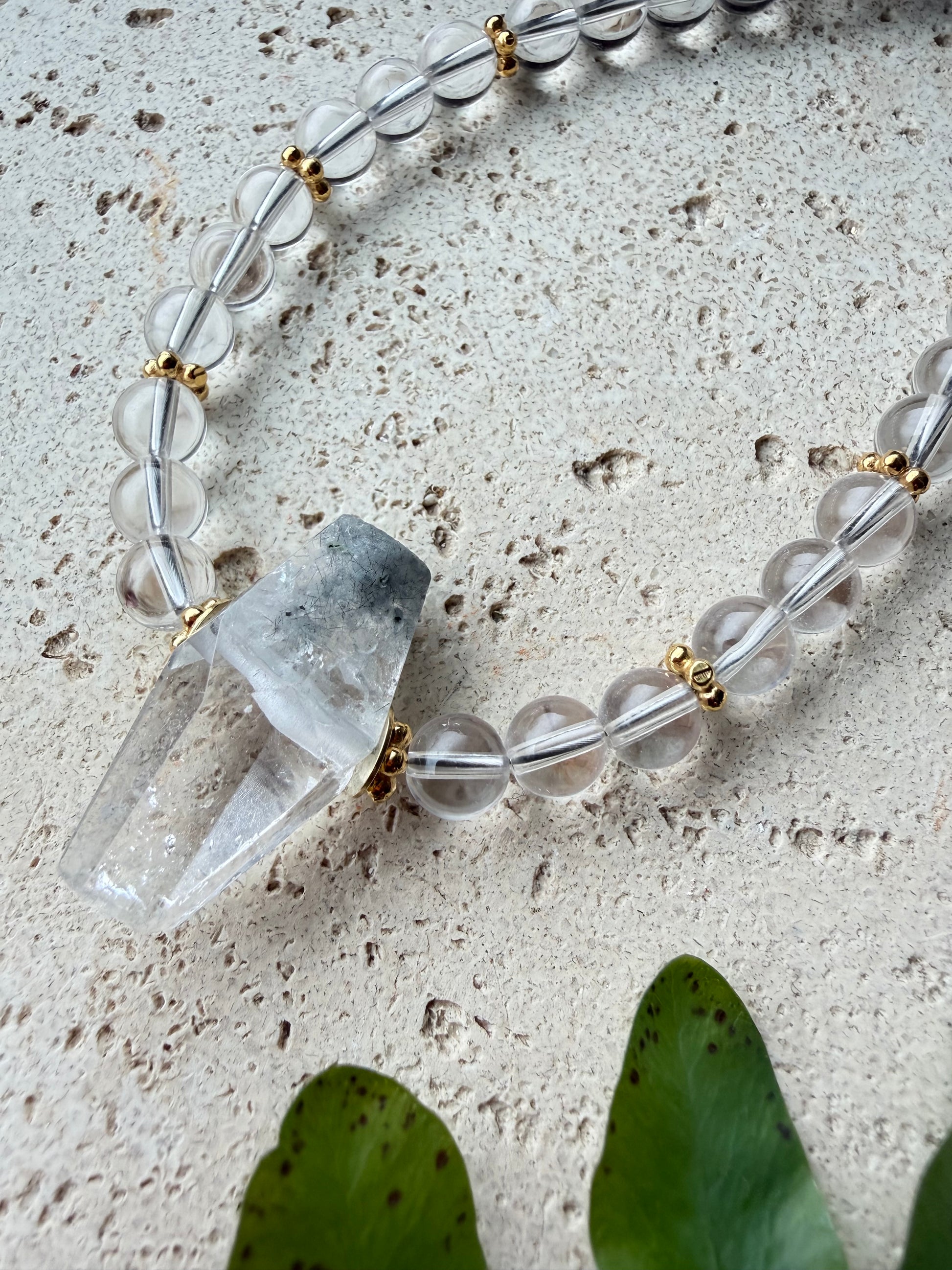 Diese außergewöhnliche Halskette kombiniert klare Bergkristall-Kugeln mit einem eindrucksvollen, facettierten Inklusenquarz-Anhänger.