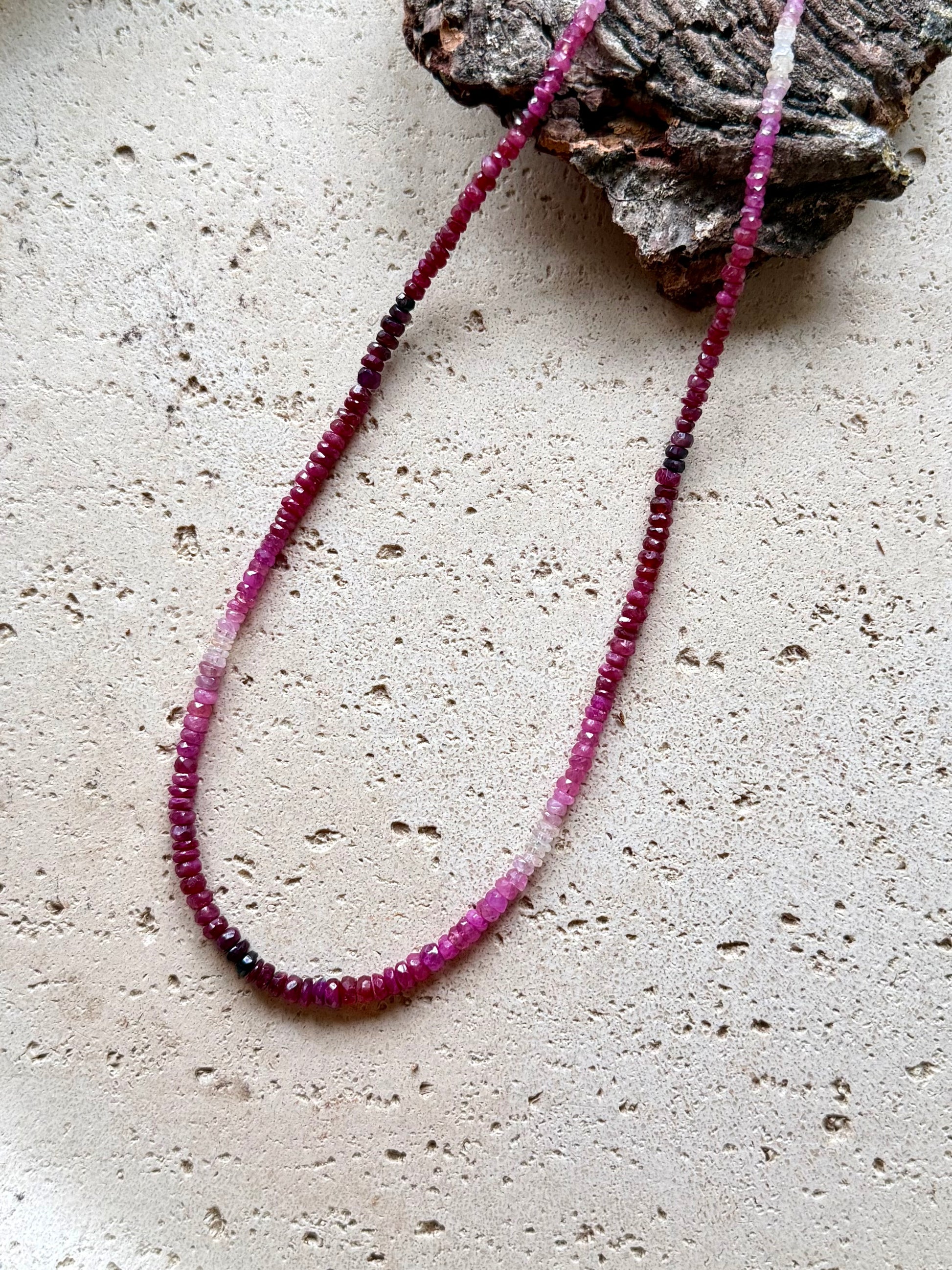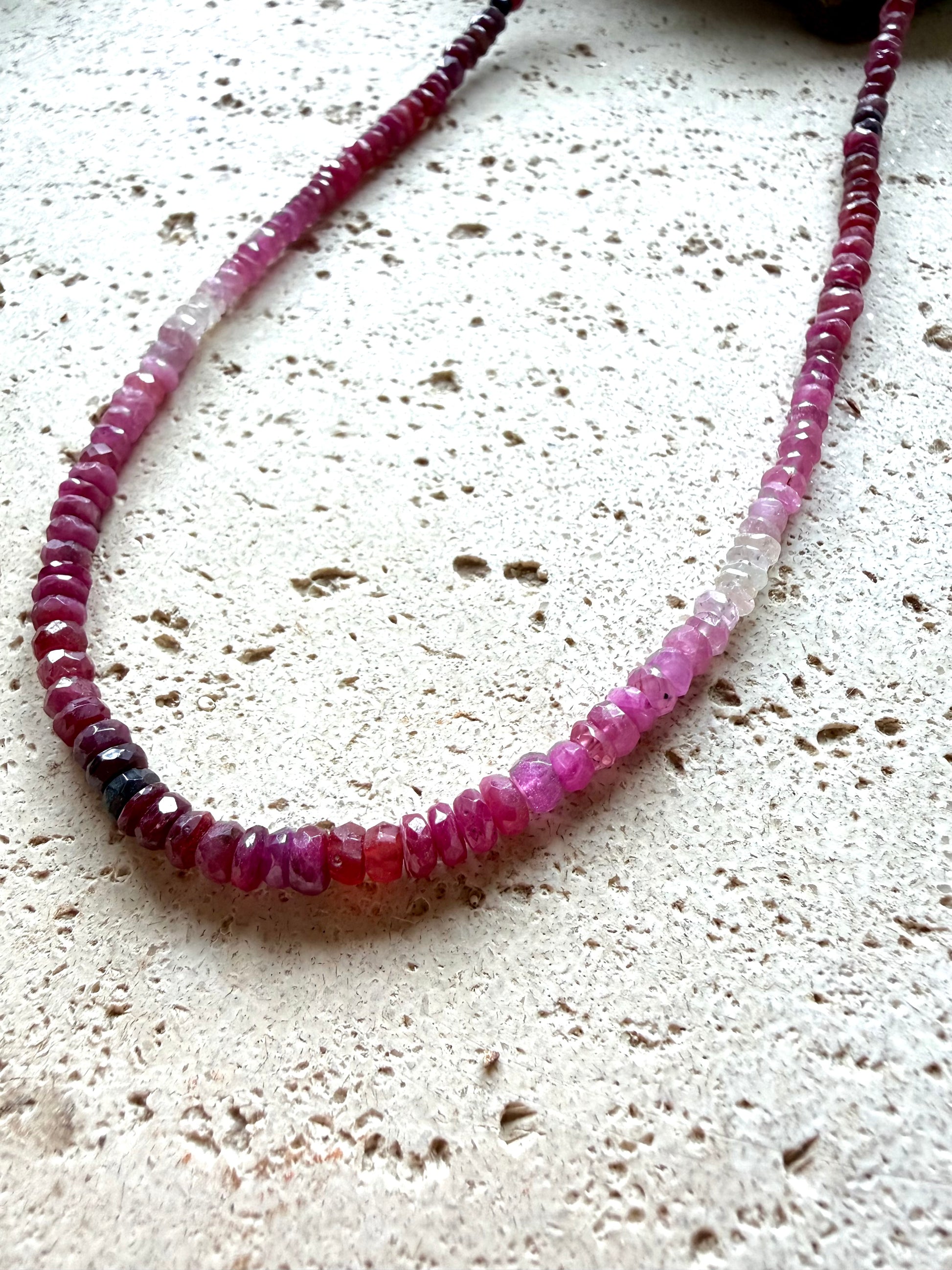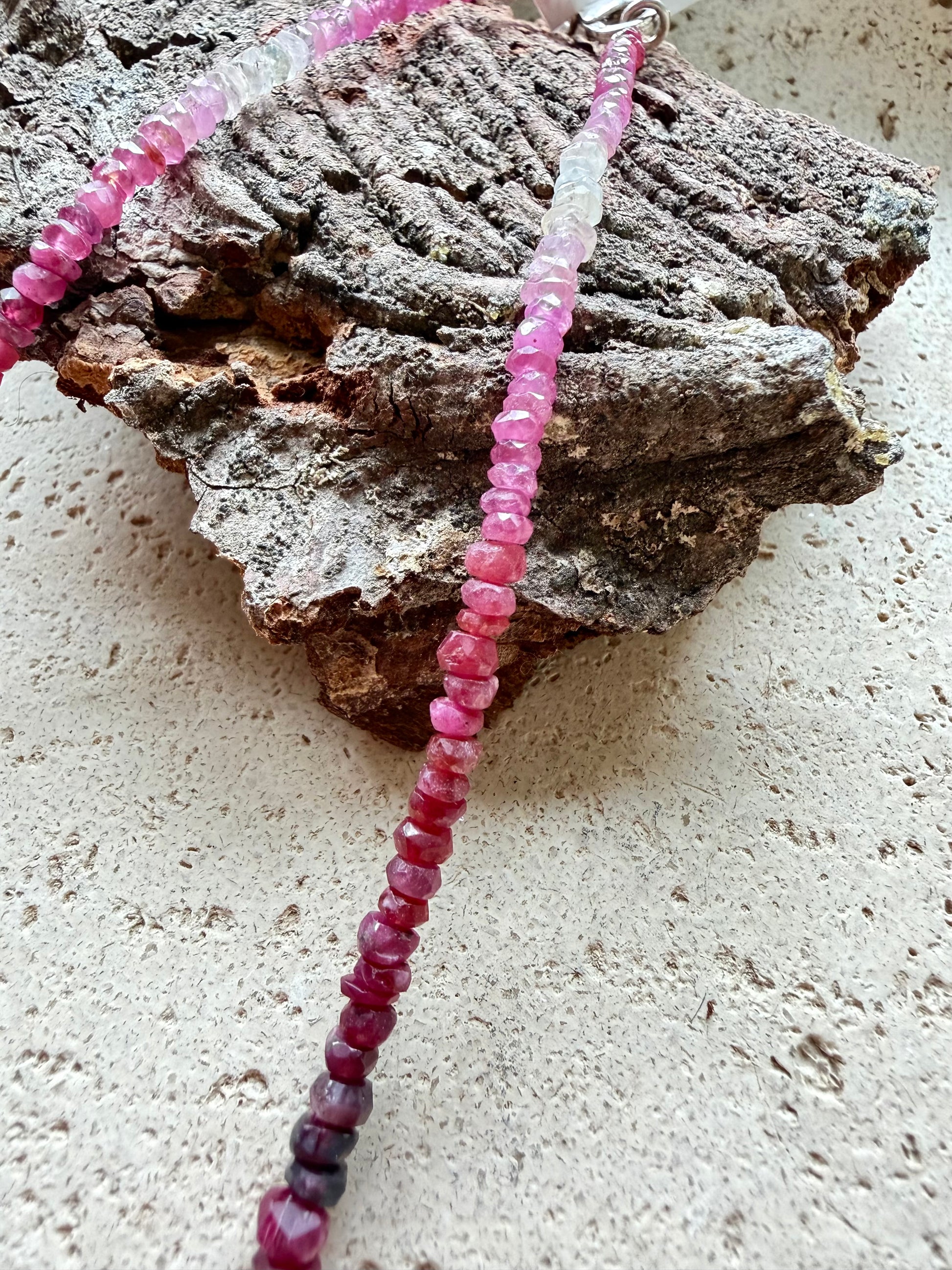Dieses feine Rubin-Collier besticht durch seine lebendige Farbvielfalt von zarten Rosé-Tönen bis hin zu tiefem Rubinrot. Die facettierten Rubinperlen reflektieren das Licht sanft und verleihen der Kette eine edle, natürliche Ausstrahlung.
