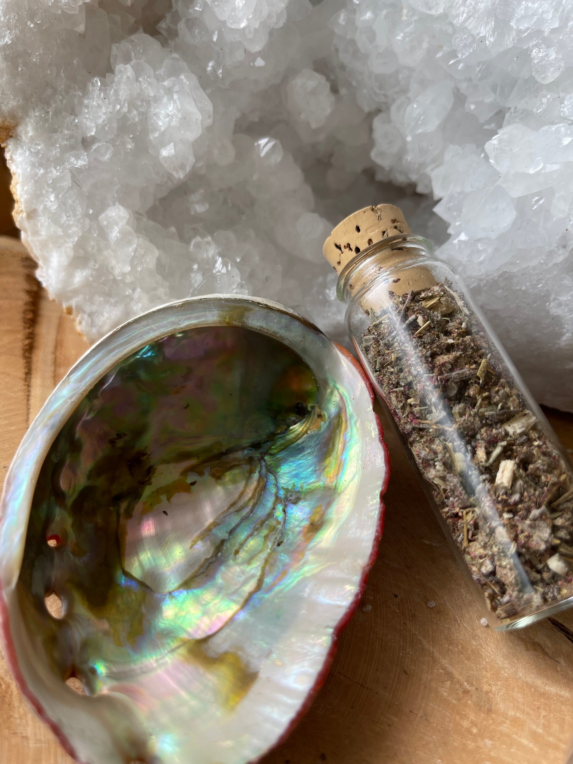 Der Inhalt der Räuchermischung besteht aus heimischen Pflanzen (Beifuß, Rose, Salbei, Fichtenharz, Kampfer)
