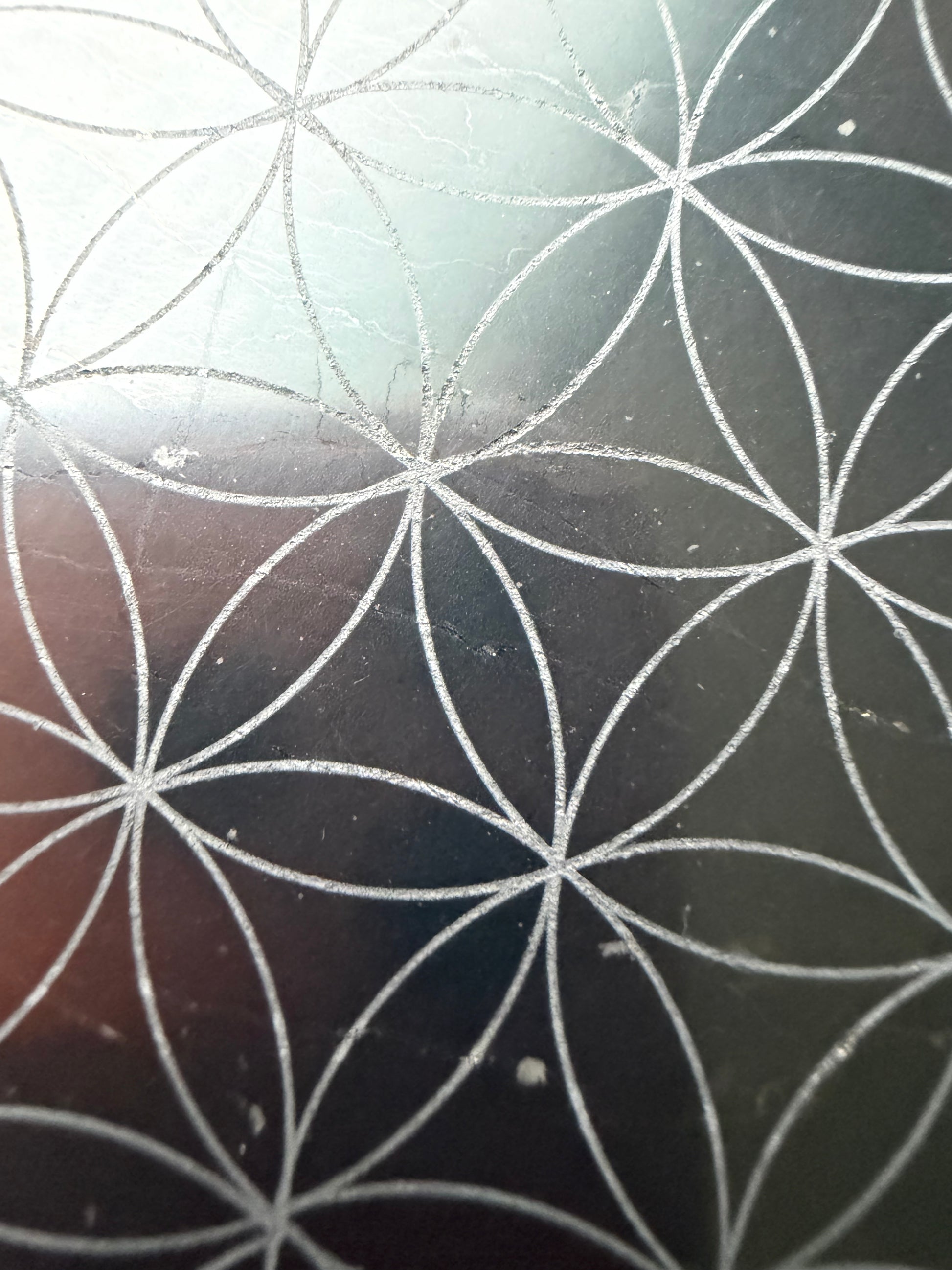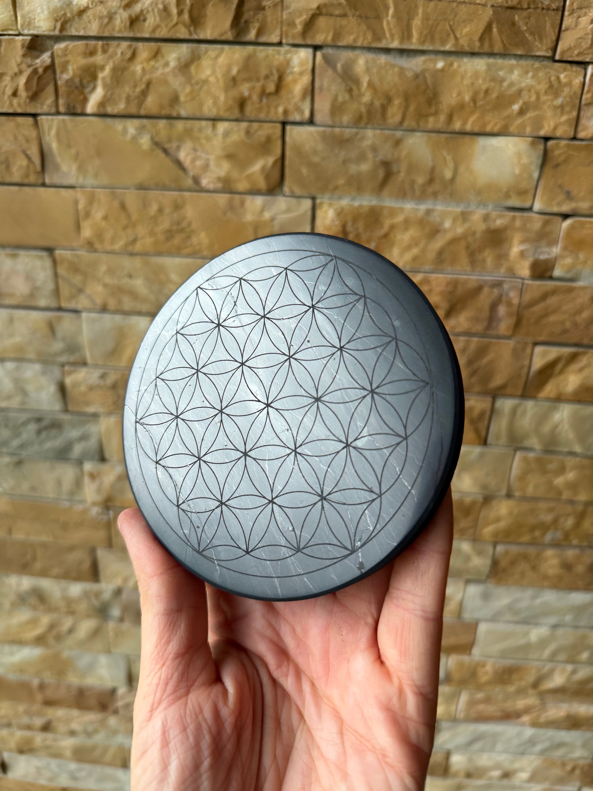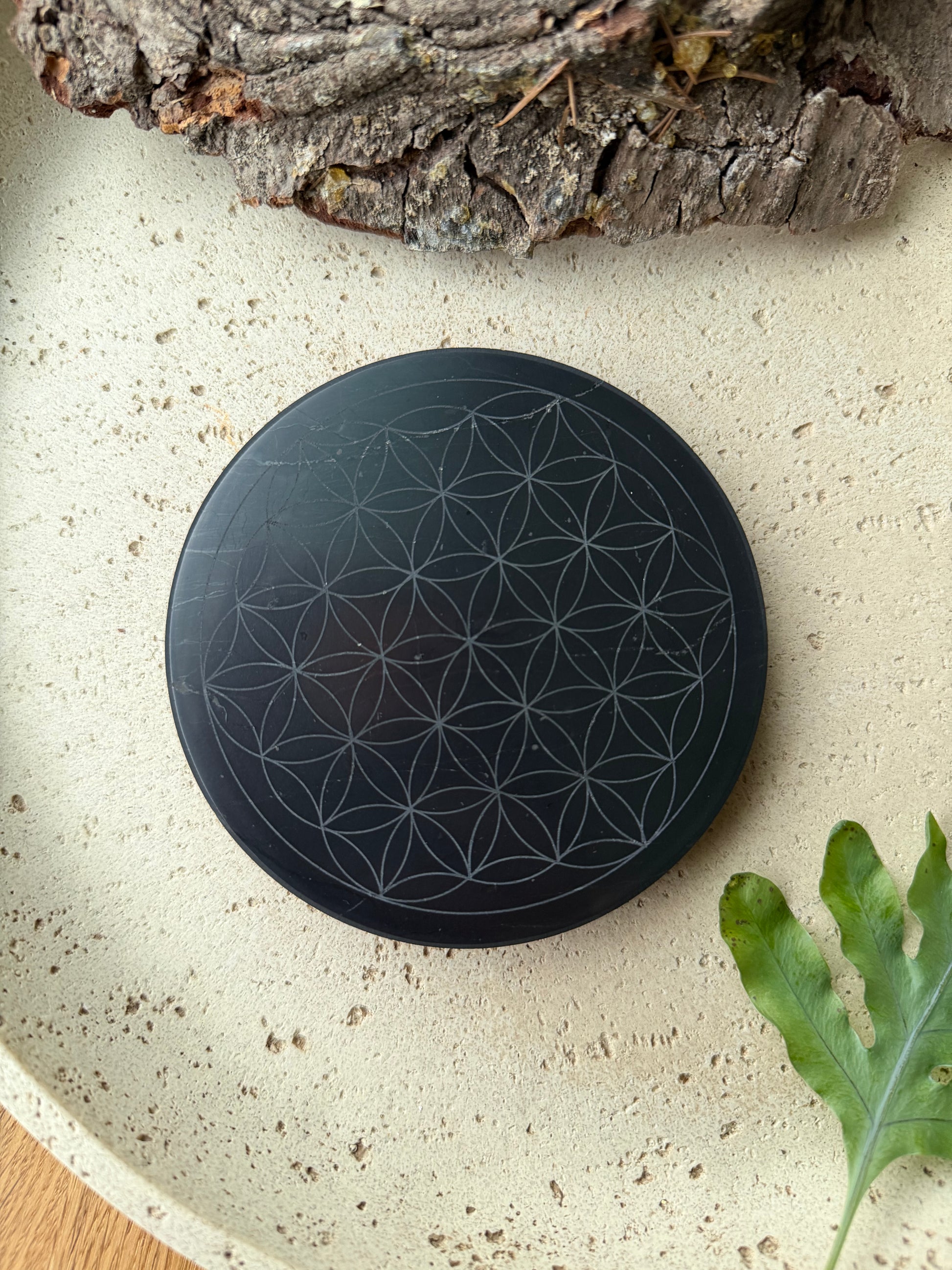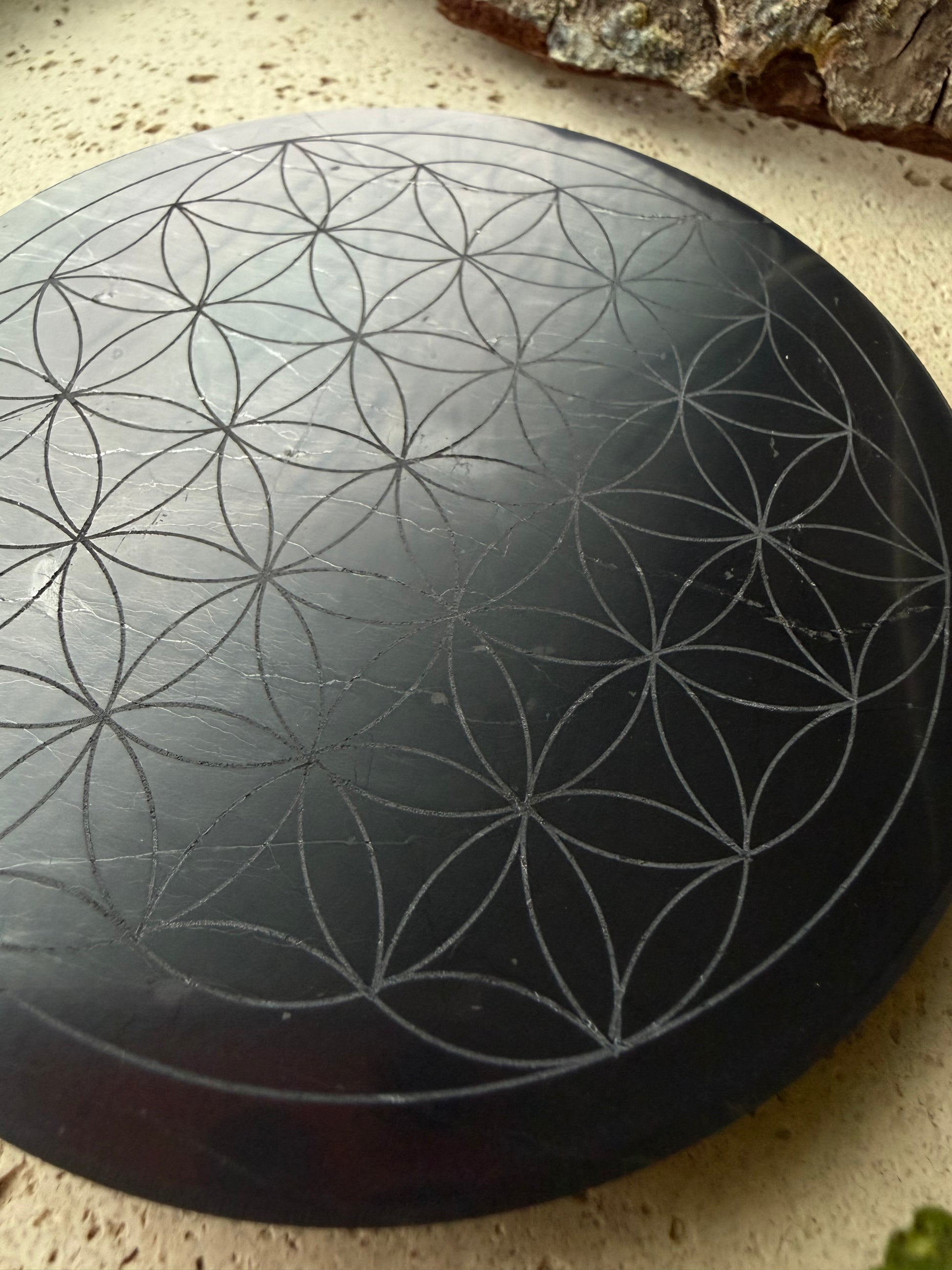 Schungit Platte – 10 cm Ø | Blume des Lebens Gravur