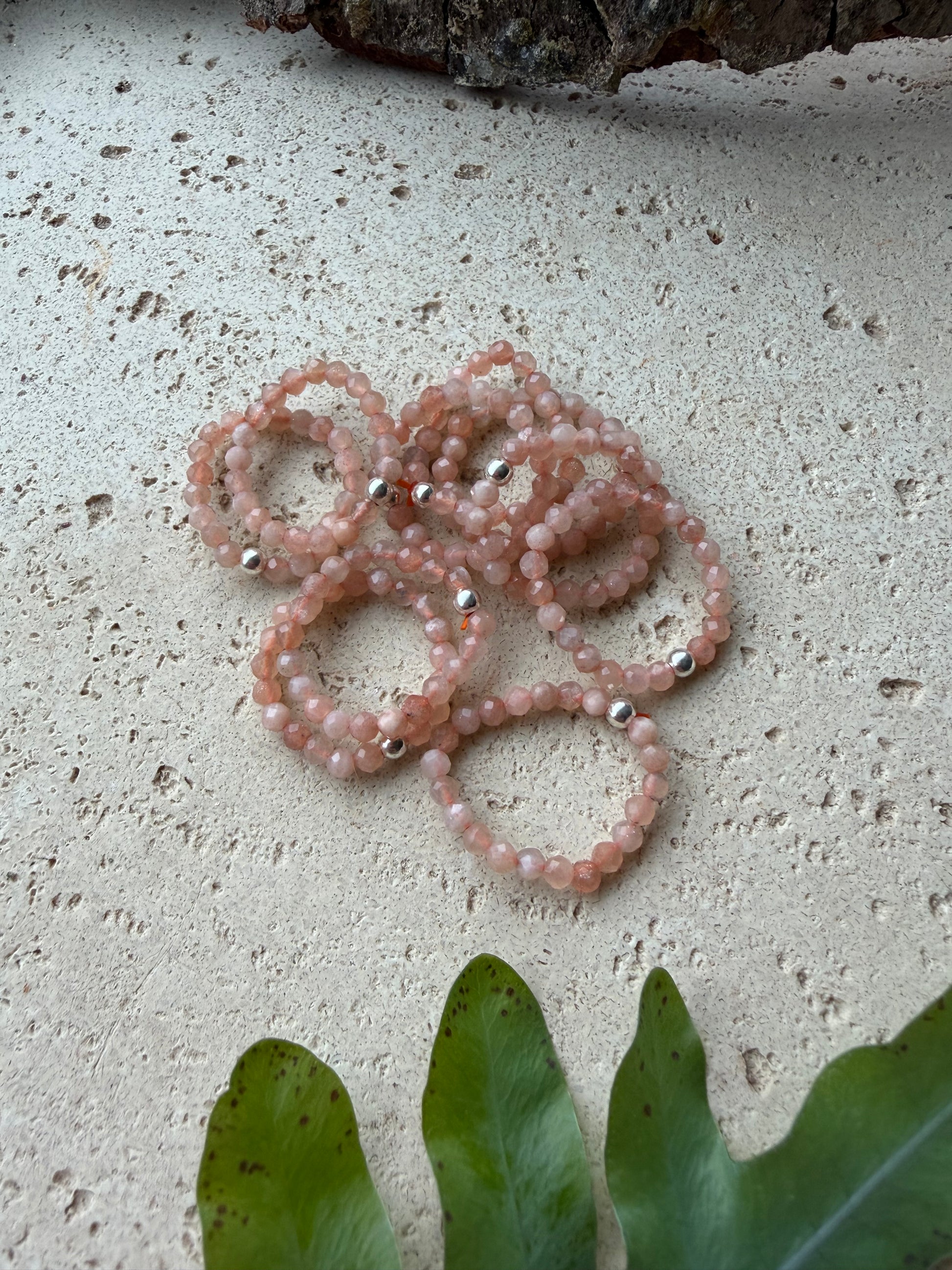 Dieser zarte Ring besteht aus echten, facettierten Sonnenstein-Perlen, die durch ihren warmen Schimmer und die feinen Lichtreflexe besonders elegant wirken. Durch das elastische Stretchband passt sich der Ring angenehm und flexibel verschiedenen Fingergrößen an – ideal für den Alltag und für alle, die dezente Edelsteinakzente lieben.