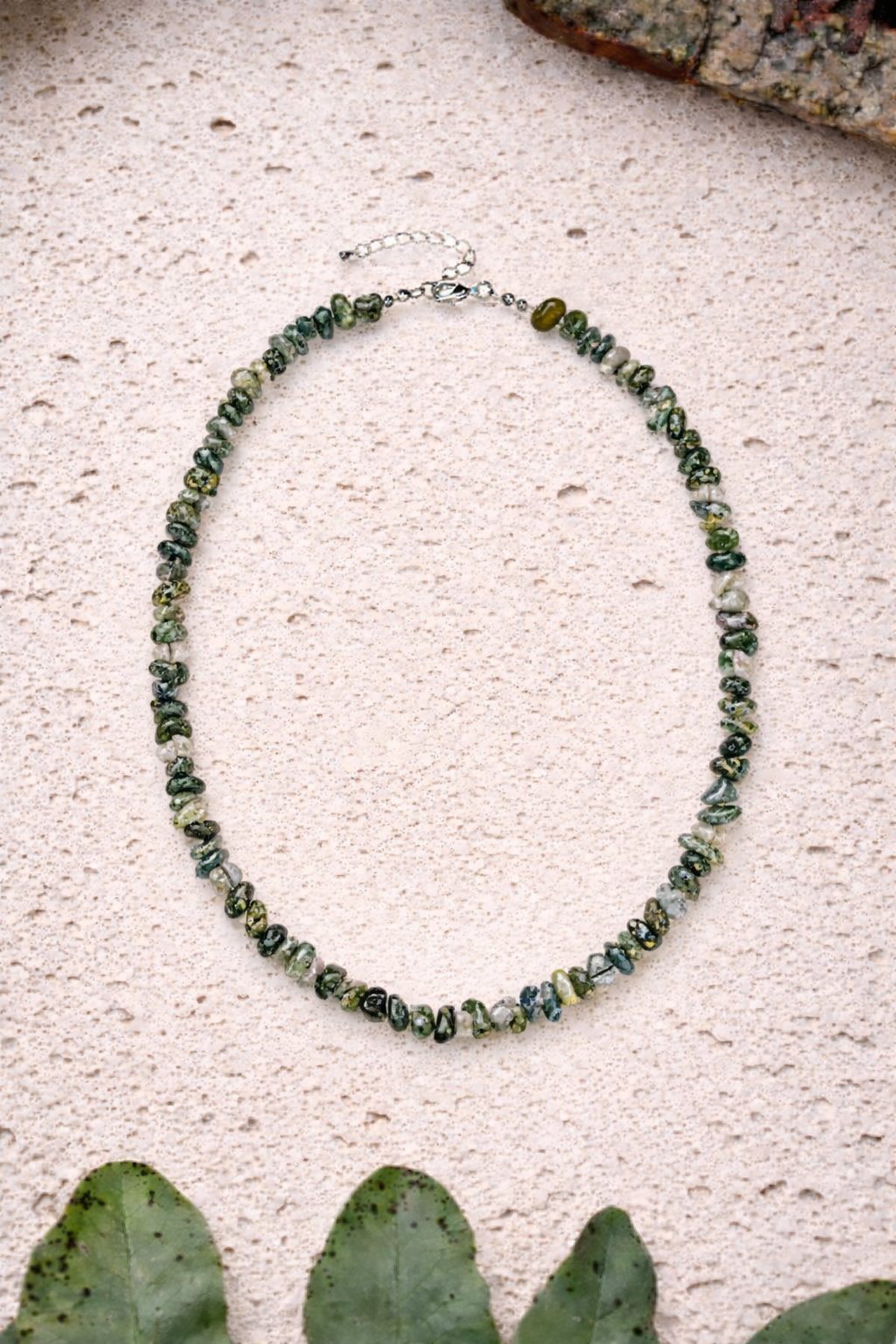 Natürliche Splitterhalskette aus Moosachat – ruhig, organisch und zeitlos.
