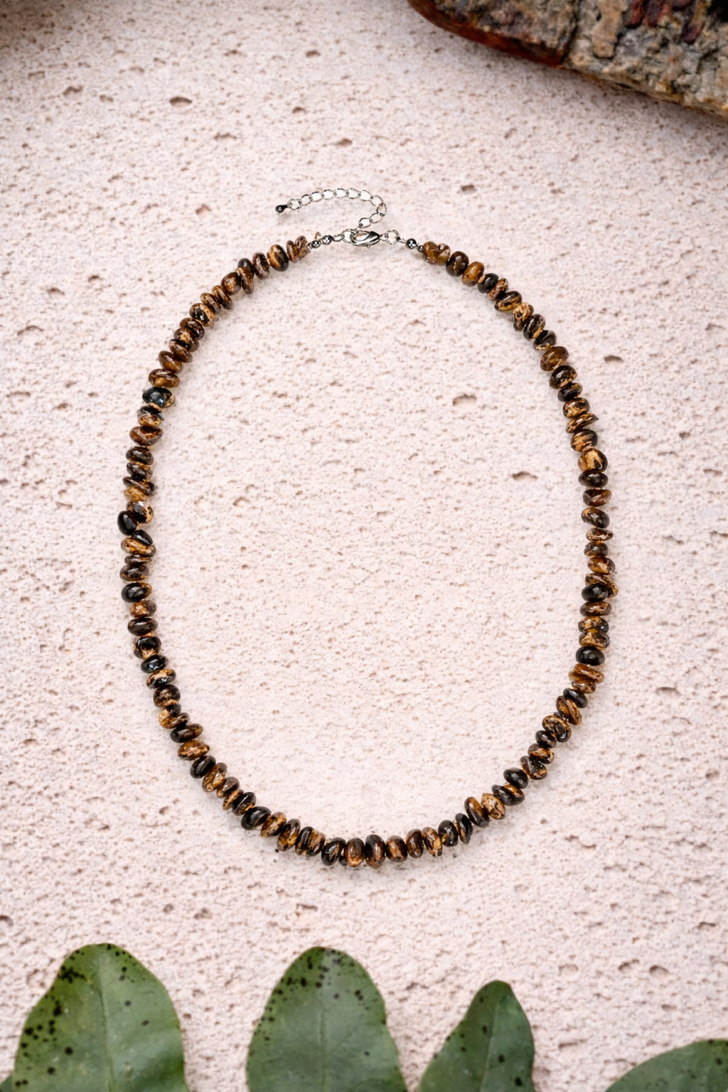 Diese Splitterhalskette aus Tigerauge zeigt den typischen goldbraunen Schimmer, der bei Lichteinfall besonders zur Geltung kommt. Die Splitter verleihen der Kette Tiefe und Struktur.